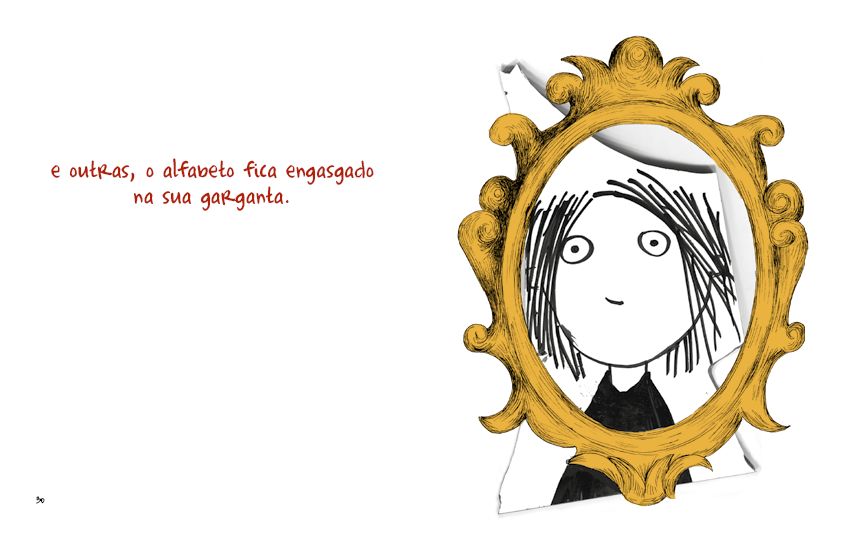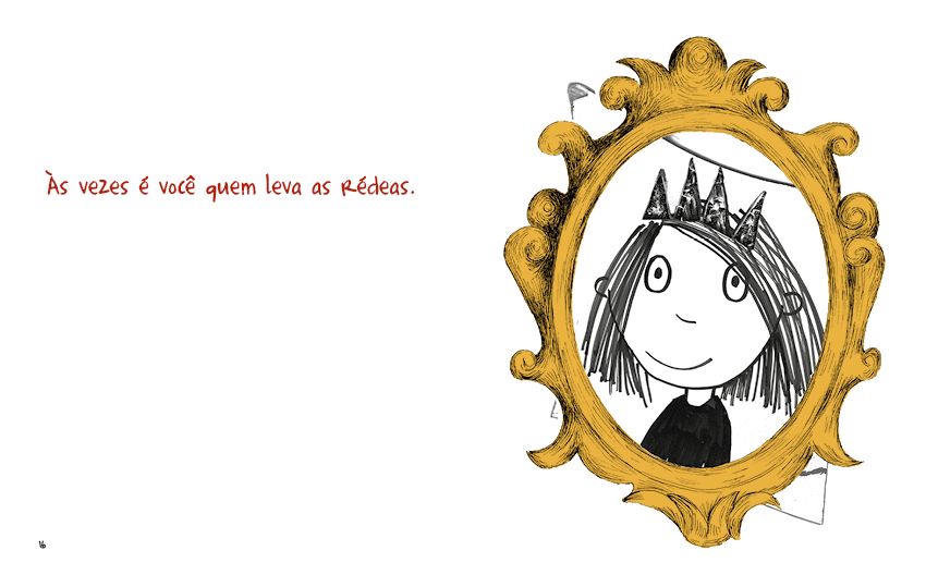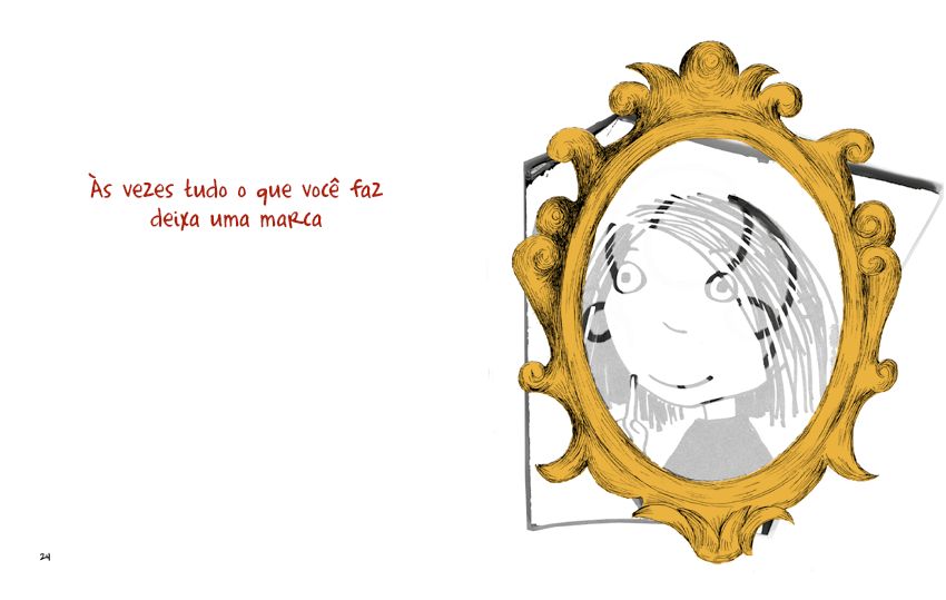 Às vezes não há nada mais surpreendente que se olhar no espelho. Porém, o espelho jamais dá conta de refletir a imagem de forma completa e, o olhar, oferece-nos sempre diferentes fragmentos de nós mesmos. Claudia Rueda traz à luz sentimentos que todos experimentamos, e ao explicitar tais sentimentos, que ora nos acalentam, ora nos inquietam, o livro sugere que estes não são particulares a uma única pessoa. Uma reflexão isolada pode ser ampliada com o olhar do outro e pela possibilidade de se conectar a ele. Neste texto breve e direto, a autora e ilustradora dá vida a personagem que se observa através de fragmentos de espelhos que variam de forma e tamanho, sempre envolvidos por uma mesma moldura que, curiosamente, não os encerra.