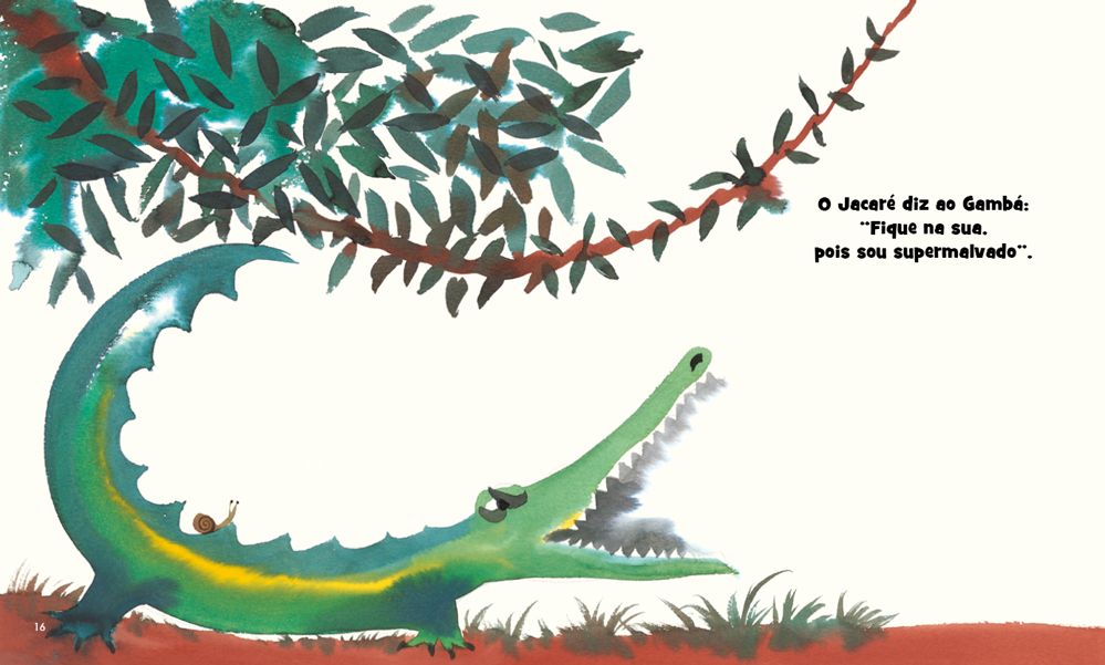 Aí está o jacaré, o chefão da hora de brincar. Ele atormenta, ele irrita, ele maltrata, uma verdadeira peste… até chegar o momento em que esse terror será, enfim, esmagado. Um jacaré intimida diferentes animais com um bordão “fique na sua, pois sou supermalvado”. Os animais, por sua vez, contrapõem a essa “supermaldade” seus “superatributos”, como, por exemplo, o “superpeso” do elefante ou o “superbarulho” do chacal. Com suas premiadas ilustrações, Alessandro Sanna nos traz uma história onde a intimidação não tem espaço, e o intimidador acaba por se revelar como o verdadeiro intimidado.