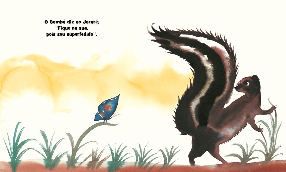 Premiado autor e ilustrador, ganhador duas vezes do Prêmio Hans Cristian Andersen, Alessandro Sanna nos traz uma história onde a intimidação não tem espaço. Os outros animais resistem à intimidação do jacaré, cujo tamanho diminuí a cada página, mostrando aos pequenos leitores, com muita leveza e humor, que mesmo os intimidadores perdem força diante de uma resistência organizada e coletiva.