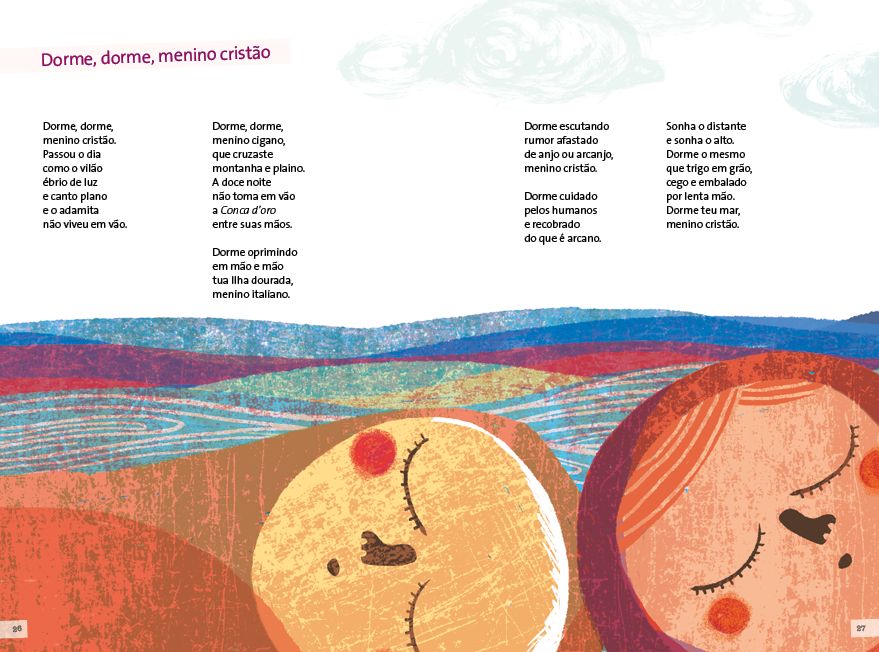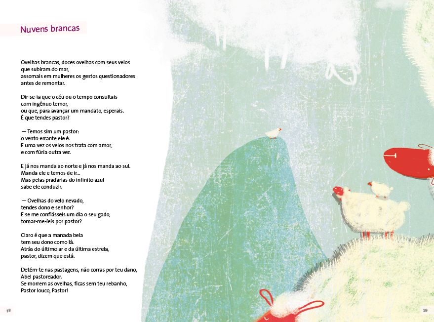 Gabriela Mistral é uma das mais importantes escritoras da América Latina, tendo sido a primeira latino-americana a receber um Prêmio Nobel de Literatura. Na seleção feita para a coleção “Poemas Ilustrados” está uma amostra de sua grande produção, onde estão presentes em versos livres ou de estrutura de rima clássica, o tom suave e temas como a infância, as relações familiares, a natureza e celebrações à sua terra natal, o Chile. As ilustrações de Bernadita Ojeda exploram sentidos dos poemas e sensações por eles provocadas, indo para além da mera representação do que diz o texto e enriquecendo também o repertório de leitura de imagens.