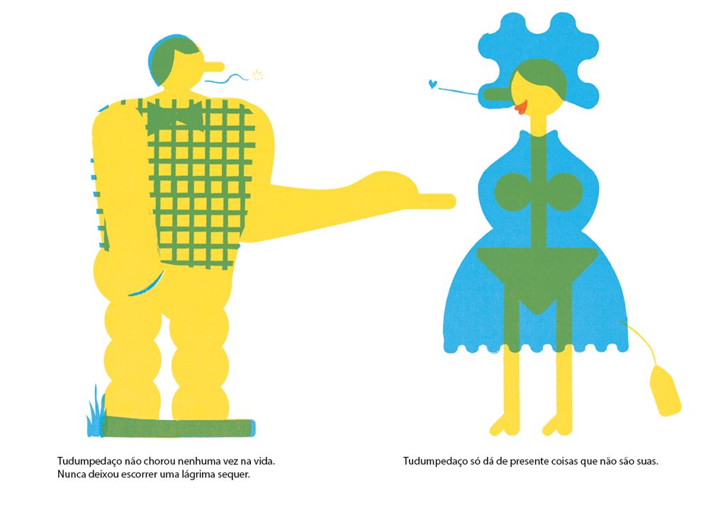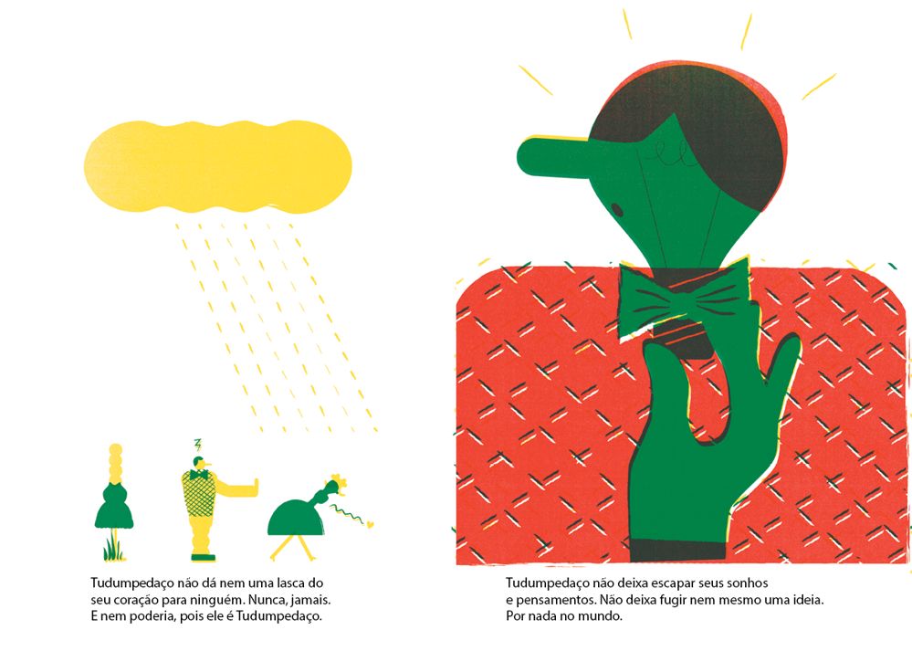 O premiado Tudumpedaço traz as aventuras de um herói um tanto esquisito, que possui esse mesmo estranho nome, Tudumpedaço. Nosso herói tem características particulares relacionadas ao fato de ele não se dividir: ser esperto, forte, nunca se esquecer de nada, nunca compartilhar uma ideia ou sentimento, nunca chorar. Essa rotina, então, se quebra, literalmente, com um acidente que força a divisão de nosso personagem e, dessa maneira, faz com que ele (ou eles agora) elabore(m) outras formas de viver.