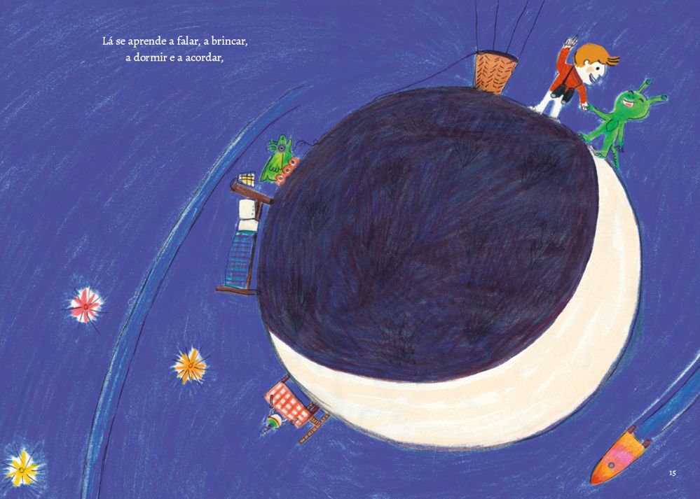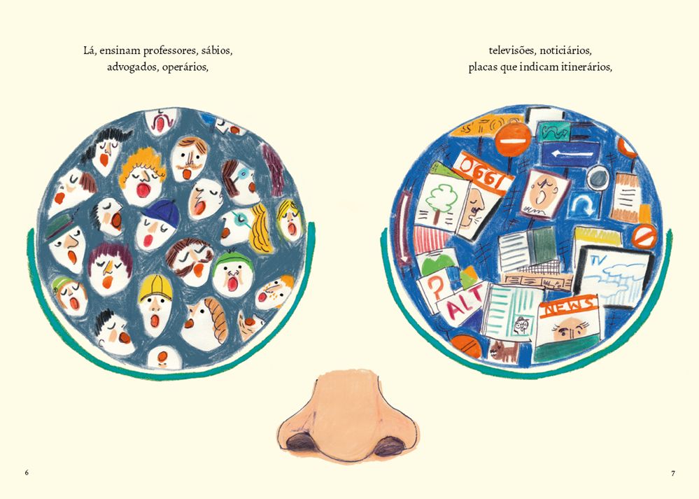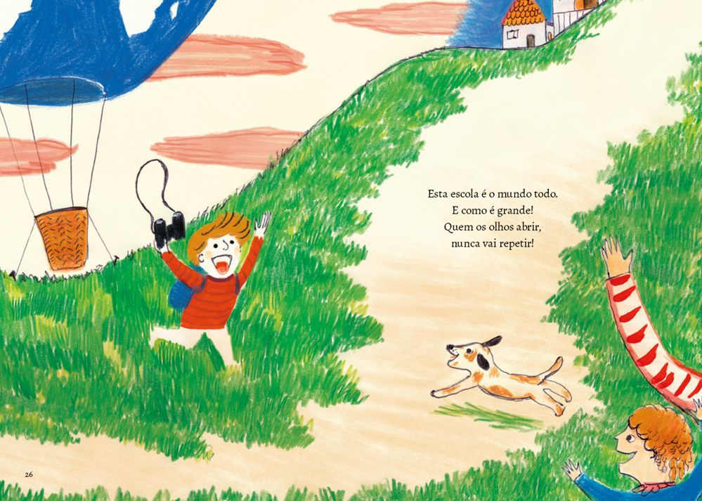 Os mapas que aparecem no início e fim do livro mostram onde acontecem essas aulas sem sala. Pelos binóculos da criança que viaja de balão pelas páginas, vemos que os ensinamentos vêm de muitas vozes – sábios, operários, placas e noticiários. O texto simples é ritmado com algumas rimas, que convidam a ler e reler, imaginando as narrativas que cada imagem carrega. Crianças e adultos se descobrem aprendizes e podem seguir sempre por essa escola com o olhar atento da descoberta, tão característico da infância.